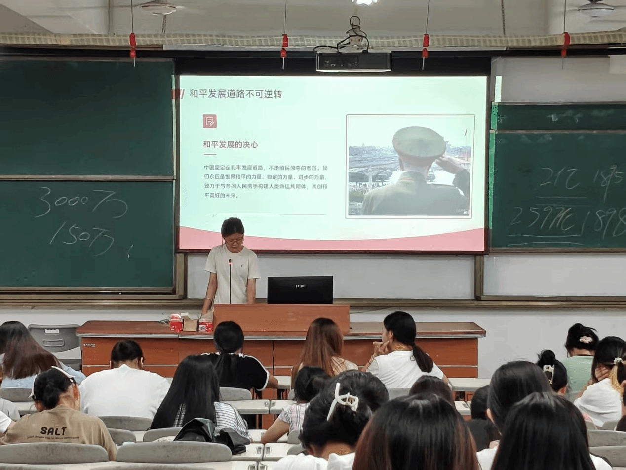 分享会上,陆煜晗以清晰的脉络搭建起解读框架,从六个核心维度展开分享。“胜利回望”环节,她结合史料片段与历史故事,回溯了中国人民抗日战争从艰难抵御到最终凯旋的壮阔历程,那些山河破碎中的坚守、浴血奋战里的不屈,让在场学子深刻体会到胜利背后的沉重代价。